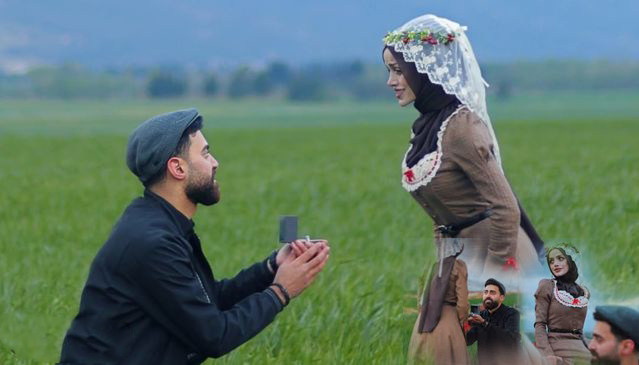 ظهر يوسف فرحات في الفيديو وهو يمتطي حصان أبيض، متجهًا نحو عبير الجالسة في حقل مفتوح، حيث ترجل من الحصان وركع على ركبته ليقدم لها خاتم الخطوبة، في مشهد استوحى أجواء القصص الخيالية.